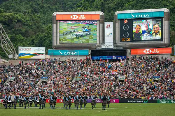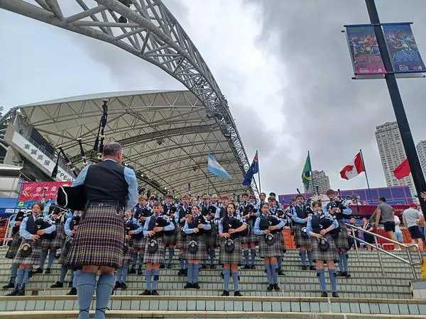 During the Hong Kong 7s, at the stadium as fans arrived, the pipe band played traditional Scottish tunes on the steps at the front of the stadium. With fans in all kinds of fancy dress, ready for the HK7s party, it was a great atmosphere.