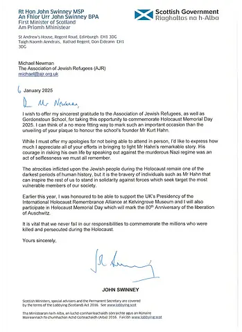 Frank Harding MBE, who devised the AJR plaque scheme, is an AJR Trustee and added that; “it is our great pleasure to unveil our latest commemorative plaque, this time to honour the pioneering and visionary educationalist Kurt Hahn. The AJR is deeply honoured that this initiative has attracted the support of Her Royal Highness The Princess Royal and the First Minister of Scotland. Having been briefly imprisoned as both a Jew and a notable and prominent outspoken critic of the Nazi regime, Kurt Hahn fled to Britain in 1933. He brought with him the ethos and values he inculcated at Salem in Germany and which have enabled Gordonstoun to burnish its international reputation as a leading and inspiring institution of learning. The plaque recognises Hahn's remarkable contribution to British society and forms part of the AJR’s mission to bring awareness of how Nazi oppression and the Holocaust impacted the lives of people who rebuilt their lives in this country. Our plaque scheme complements the other resources we have assembled, including our testimony archives, that help bring the past into the present and perpetuate the memory of the Jewish refugees.”