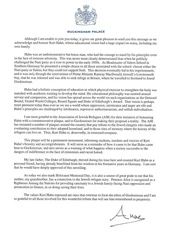 To mark the event The Princess Royal - ‘Warden’ at Gordonstoun - expressed her thanks to the AJR and the school, for honouring Hahn. In a letter read out at the service. Princess Anne also wrote of her “great pride” that her grandmother, Princess Alice, is recognised as a Righteous Among the Nations for providing sanctuary to a Jewish family facing Nazi oppression and persecution in Greece.