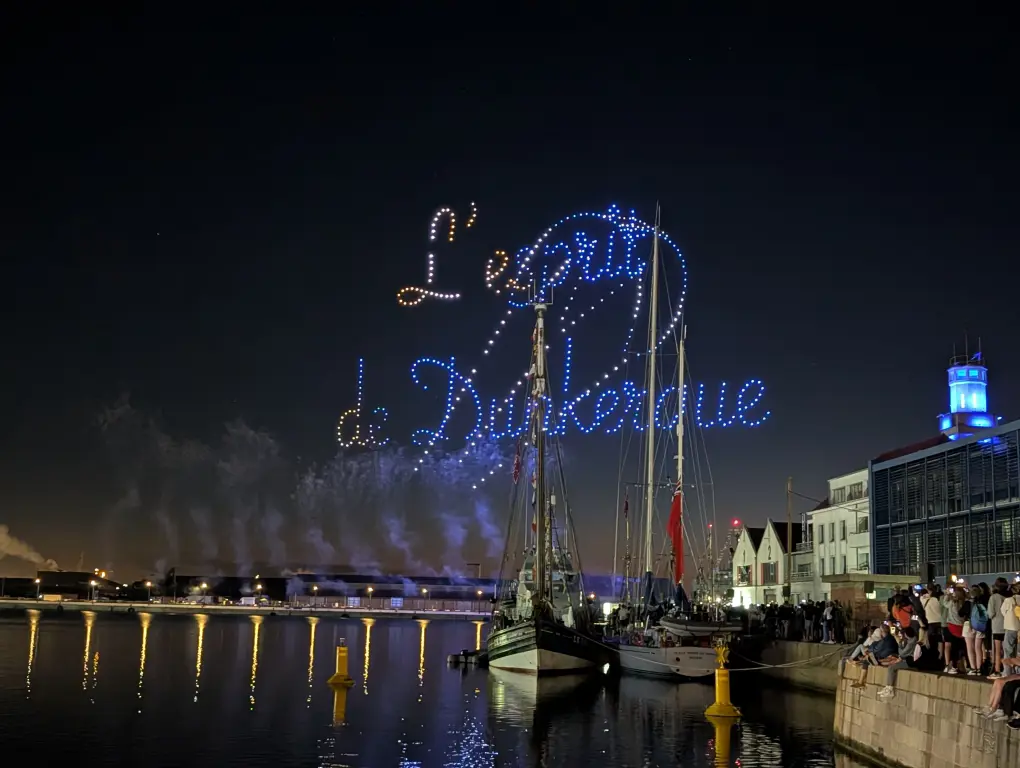 Once in Le Havre, the crew started their real experience of Tall Ships 2025, with Race One consisting of Le Havre to Dunkirk. The subsequent three day stay at Dunkirk, who were hosting Tall Ships for the first time, was notable for an impressive light show from drones one evening and the first sight of so many ships in one port for many of our crew.